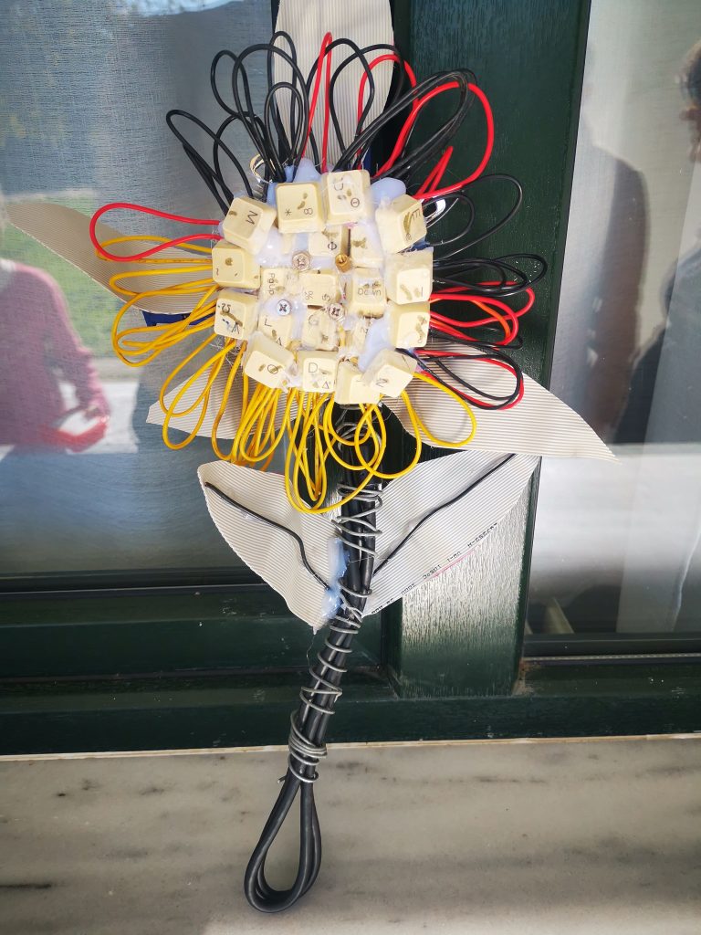 - Ένα λουλούδι, δημιουργημένο από τμήματα πληκτρολογίων και ηλεκτρονικών υλικών, ως υπενθύμιση ότι ακόμη και τα πιο «άχρηστα» αντικείμενα μπορούν να μετατραπούν σε κάτι όμορφο και χρηστικό.