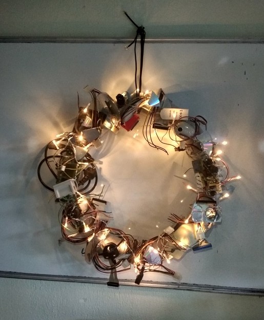 - Ένα στεφάνι, φτιαγμένο από καλώδια και μικρά εξαρτήματα υπολογιστών, που συμβολίζει τον κύκλο της ζωής των συσκευών και την αξία της επαναχρησιμοποίησης.