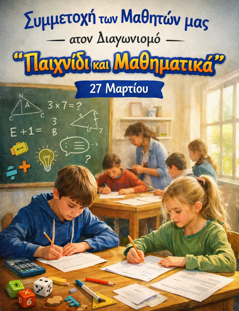 Στις 27 Μαρτίου, οι μαθητές και οι μαθήτριες της Ε΄ και ΣΤ΄ τάξης του σχολείου μας συμμετείχαν στον διαγωνισμό «Παιχνίδι και Μαθηματικά», που διοργανώνεται κάθε χρόνο από την Ελληνική Μαθηματική Εταιρεία.